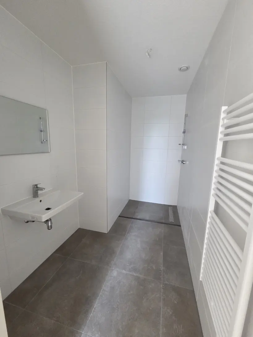 De badkamer is afgewerkt met grootformaat wand- en vloertegels, een inloopdouche, een wastafel van Villeroy & Boch en een handdoekradiator.